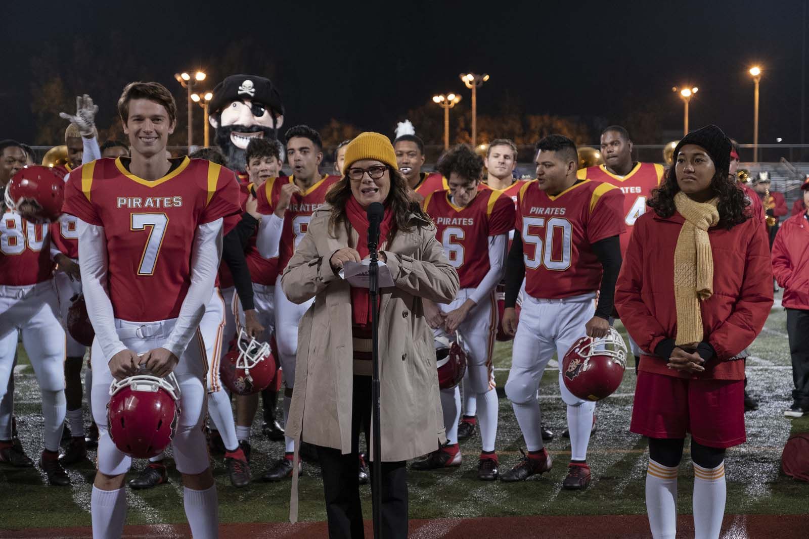 Si l’on se contente de distinguer deux sexes, en laissant la plus grosse par de hontes aux messieurs, le film en oublie ou alors ne souhaite pas affronter la réalité du racisme, notamment envers les afro-américaines. De la même manière, le sidekick comique au rang institutionnel n’est pas aussi perméable qu’on le laisse entendre, bien que l’on mette le doigt sur l’aspect désincarné de l’emploi et des responsabilités sociales. Ces occasions manquées accentuent une lassitude au niveau du ludique et intellectuel de l’exercice. À l’image des blasphèmes qu’on dénonce, l’œuvre n’est construite qu’en retournant une liste contre elle-même, mais elle ne s’en sert jamais à bon escient dans un engagement pourtant crédible, même dans ses approximations. On compose tout de même avec quelques figures emblématiques, comme le capitaine ultra populaire de football du bahut (Patrick Schwarzenegger), la meilleure amie intensément boudée et évincée (Lauren Tsai), la nouvelle progressiste (Alycia Pascual-Pena), sans oublier le partenaire parfait et pro-féministe (Nico Hiraga). Mais, c’est avec aussi peu de consistance que l’on s’éparpille juste assez pour retomber sur nos clichés et le politiquement correct, desservant ainsi tout ce qu’il y avait d’encourageant.