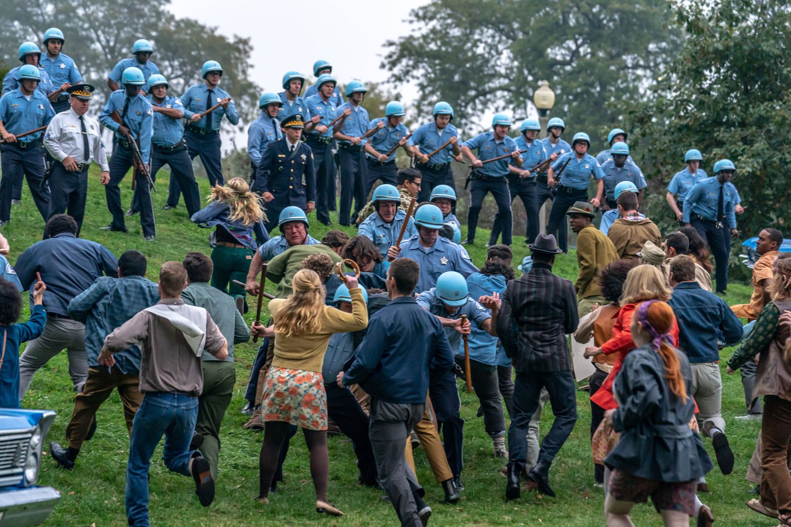 Sont-ils finalement sept, huit ou un millier ? Ce n’est pas tant leur nombre qui compte, mais leur nom, leur voix et leurs actions. Les Chicago Seven ont finalement trouvé un scénariste, prêt à plaider en faveur de la justice ou peut-être tout simplement de la vérité. Et bien qu’Aaron Sorkin ne soit pas le premier à s’y baigner, rappelons toutefois qu’un certain Jean-Luc Godard (Vladimir et Rosa) est passé par là et que d’autres se sont bien inspirés des conséquences (Peter Watkins et Woody Allen notamment). Celui qui a surligné quelques épisodes rebondissant sur une Amérique en transition et en constante opposition avec son patrimoine et son héritage, il revient avec un procès dont la complexité se gagne d’abord par la narration.