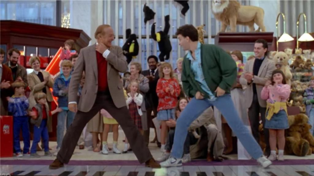 Tout n’est pas parfait, mais ce sont ces quelques moments maladroits qui génèrent cette traînée émotionnelle inattendue et évidemment bienvenue. Et c’est sur la silhouette et l’habilité d’un Tom Hanks désemparé qu’on se laisse séduire. Josh Baskin a son vœu exaucé et c’est donc dans la peau d’un trentenaire qu’il doit finalement survivre et affronter le monde de demain, celui dont il convoite les possibilités, la liberté, mais dont il ignore tout des responsabilités. De ce postulat, on passe sous silence l’impact de sa soudaine évasion ou émancipation forcée, mais le schéma reste identique à cette vie qui ne cesse d’avancer pour chacun et chacune d’entre nous, à la recherche d’une stabilité de l’emploi et d’une vie privée épanouissante. C’est à la jonction des deux que Josh évolue, malgré sa poussée de croissance. Et en tutoyant d’assez prêt l’univers bureaucratique, tout en restant à l’aise avec ce qu’il sait faire de mieux de ses treize ans d’âge mental, il reste suffisamment lucide pour se laisser embarquer par le système de récompense, au détour d’un job très compétitif. Ce modèle n’a rien de satisfaisant et pourtant, le merchandising américain bat son plein et garantit une certaine forme de confort pour les employés les plus investis et les plus ambitieux.
