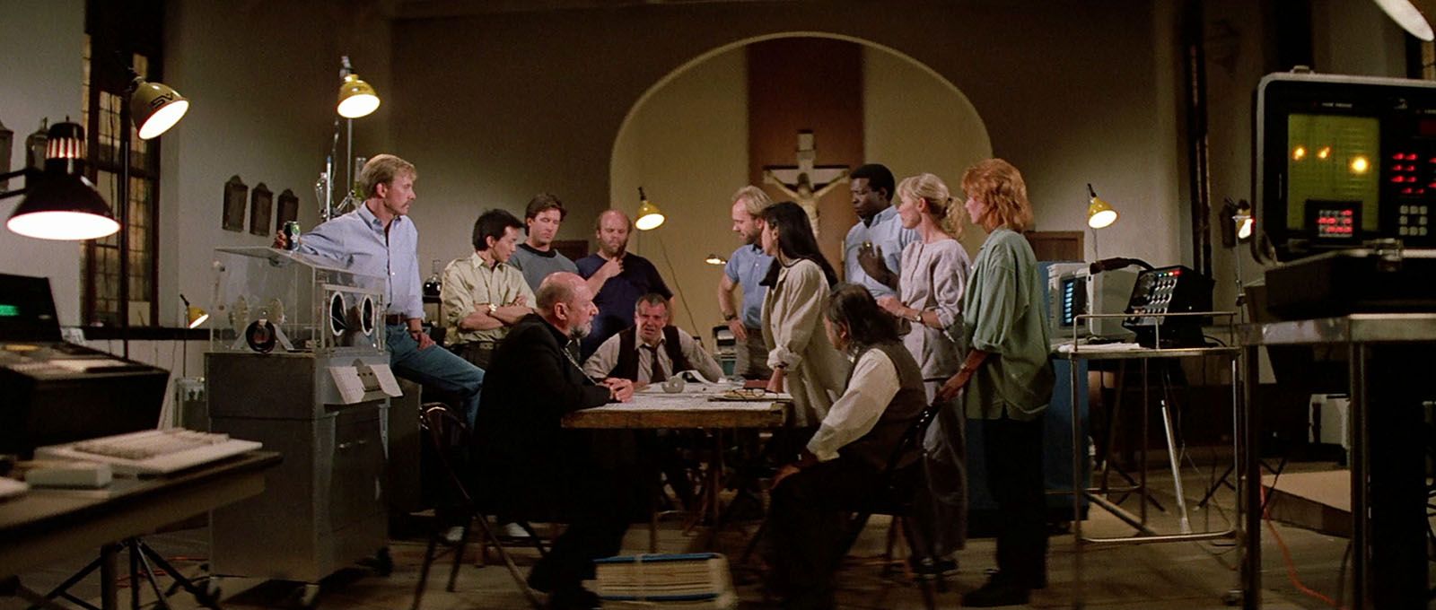 Le second volet de l’apocalypse de Carpenter aboutit, cinq ans après son premier volet et près d’une décennie après son monumental « Halloween ». Entre-temps, il aura eu le temps de se faire les griffes sur le pare-chocs de « Christine » et de s’égarer dans le musclé, burlesque et injustement mal-aimé « Big Trouble in Little China ». Il vient de nouveau sonder notre esprit et notre point de vue sur la fin du monde, celui qu’il a conçu et celui que l’on devra interpréter par les sensations. Son allusion au chat d’Erwin Schrödinger n’est pas anodine, car sa démarche consiste bel et bien à développer ses intrigues en préservant ce mystère, depuis l’extérieur de la boîte. Et pourtant, la subtilité viendra combler cette observation, dès lors qu’il place ses propres personnages dans une cage, fermée et étouffée par une abomination surnaturelle. Le huis clos s’installe alors rapidement, pour qu’enfin puisse infuser les diableries d’une force invisible et omniprésente.
