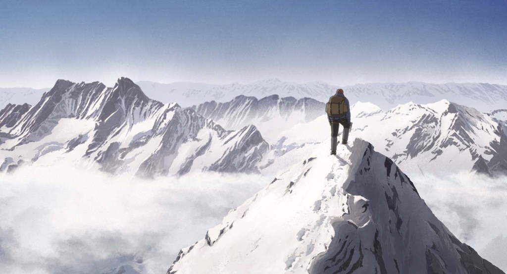 Du roman de Baku Yumemakura au manga adapté de ce dernier, l’œuvre de Jirô Taniguchi reste une pièce maîtresse de cet élan poétique et spirituelle, où les hommes font face à leurs démons et leur destinée. L’animateur Patrick Imbert (Le Grand Méchant Renard et autres contes) en a repris les commandes, pour que l’on puisse enfin coucher à l’écran les méandres des héros tragiques, qui constituent tout le récit, à mi-chemin entre le fictif et les faits réels. Secondé par la scénariste Magali Pouzol (Funan), le cinéaste parvient à joindre les deux bouts du langage animé, celui que possède le trait lisse européen et celui qui détaille les expressions faciales japonaises. Dans le milieu, parfois méconnu, de l’alpinisme, on recense des noms et des épreuves, dont l’ultime repose au sommet de l’Everest. Il s’agit là d’une quête personnelle, au-delà des plus hautes cimes du monde, là où l’inconnu et la solitude semblent dominer.