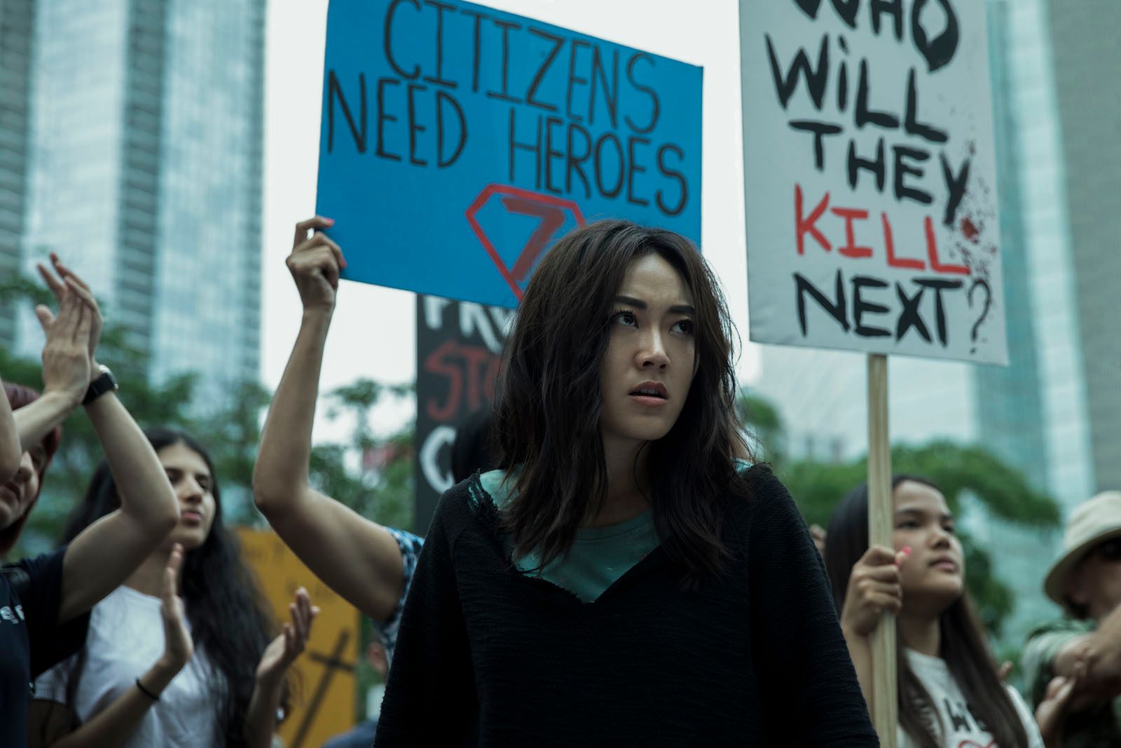 Il fallait donc un paria dans l’histoire et c’est Billy Butcher (Karl Urban) qui endosse la cape du justicier vengeur. On aura tout de même droit à une narration plus mystérieuse à son égard, mais il ne sera pas question de le dévier de sa voie. Il est ici pour ouvrir les yeux et le faire découvrir au monde. Il se revendique comme la clairvoyance d’un monde aveugle, mais la vérité serait plus proche chez un autre protagoniste. Hughie Campbell (Jack Quaid), victime d’une maladresse forcée d’un Seven, se voit propulser dans un dilemme existentiel. Il questionne les héros et nous questionne sur ce que nous idolâtrons. Son duo avec Stella (Erin Moriarty) appuie cette idée que la série prend au sérieux ses propos. La censure est très flexible, car le trash n’est pas qu’une simple option. L’hémoglobine dans la narration témoigne de cette force, crue et impitoyable.