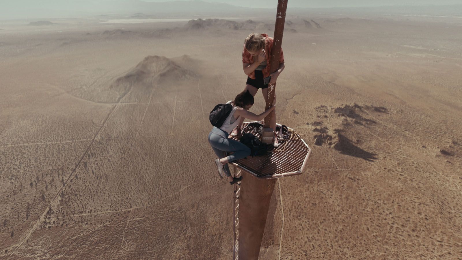 Sans détour et sans surcharger l’image d’artifices numériques, Becky (Grace Caroline Currey) fait face à la chute de son couple et peut-être de sa vie. Elle erre et s’abandonne à l’alcool, tandis que sa meilleure amie, Hunter (Virginia Gardner), vient lui proposer un challenge aussi fou qu’ambitieux. En sautant sur cette grande occasion pour faire le deuil de sa perte, la jeune femme sera de nouveau en proie à l’altitude, un redoutable outil d’effroi lorsque le cadre de Mann choisit de se pencher sur la structure radio toute rouillée. Nos héroïnes ne sont donc plus en sécurité, au sommet de leur objectif et redescendre constitue en enjeux de vie ou de mort, assez peu créatif, ou simplement trop timide.